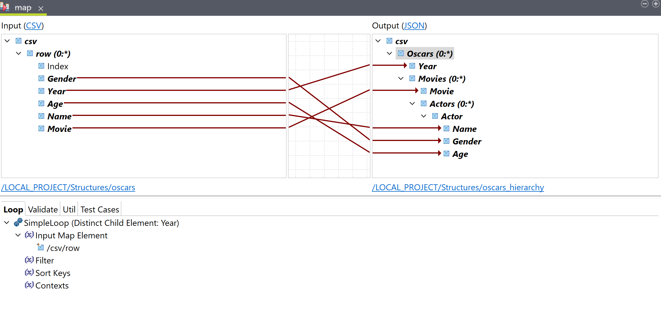 In this example, the input is a CSV file containing information about actors and actresses who have won Oscars between 1990 and 2016. The goal of the transformation is to get a JSON file in which the data is grouped by year, then by movie. The record for each movie will contain an array of the actors who won an Oscar for that movie.