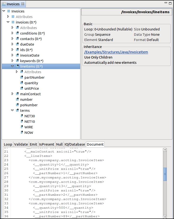 The Java importer generates a structure containing all of the fields or beans associated with your Java classes. One structure is created for each class, but they are connected using the inheritance mechanism, so they refer to each other just as they would when using Java pointers. The figure below shows a structure (from the examples) that has an Invoices class as the outer object, which refers to other classes such as Invoice, LineItem, and Contact.