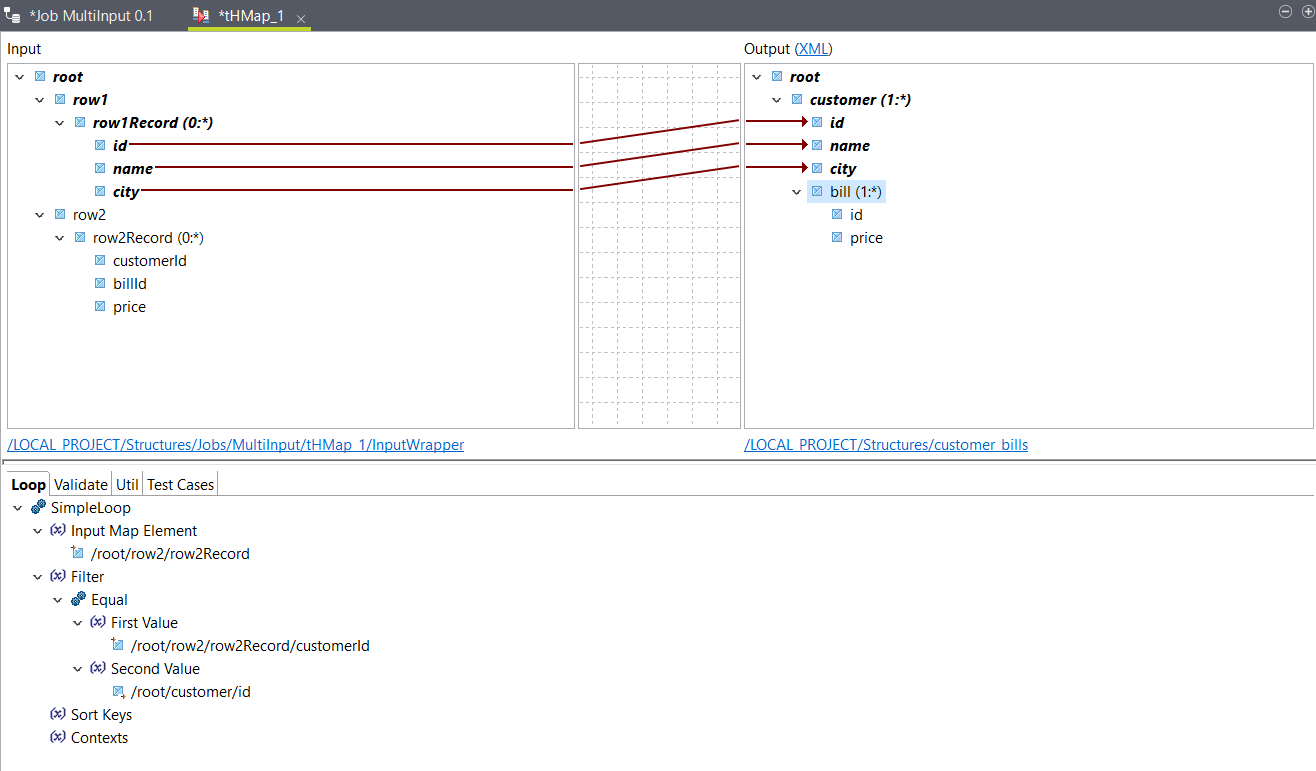 1. Drag and drop the input row1Record element to the output customer element to automatically map the id, name and city elements.