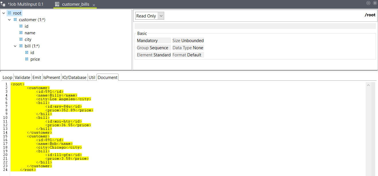 In this example, the tFileInputDelimited component named customers should have a schema with three columns named id, name and city, and the one named bills should have three columns named customerId, billId and price.