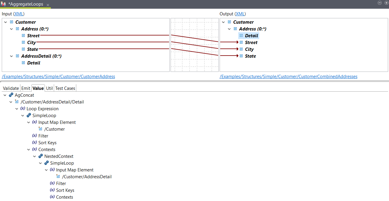 In this example, you have an input with two loops: Address and AddressDetail, and you want to map their elements to a single Address loop in the output.