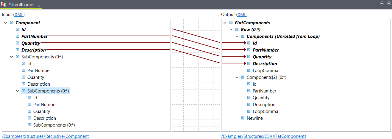 In this example, you have mapped the input Component element and you want to include in your output structure two recursive SubComponents loops on the same level as Components.