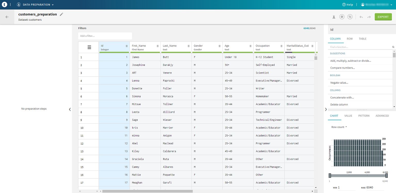 Because you imported the customers.xlsx dataset, and created the corresponding preparation using the Add preparation button, every change made to customers_preparation will be automatically saved. As for the raw dataset you imported, it can be viewed in the Datasets view, and the data remains unchanged.