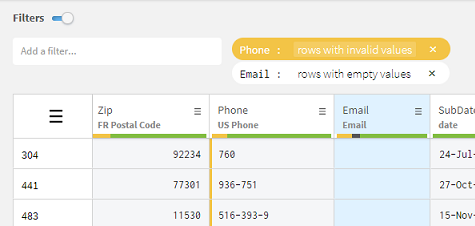 From this quality bar, you can either choose to directly remove all the rows with empty or invalid data from column, or just select them and apply a filter on your data