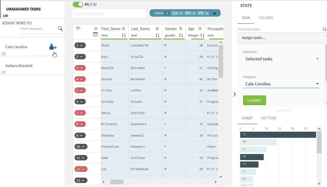Campaign owners can assign the tasks in a specific campaign to any data steward part of the campaign. Otherwise they can use Talend Cloud Pipeline Designer when working on Merging and Resolution campaigns to assign the tasks to a data steward while loading data in the campaign. They can also use the Job properties in Talend Studio.