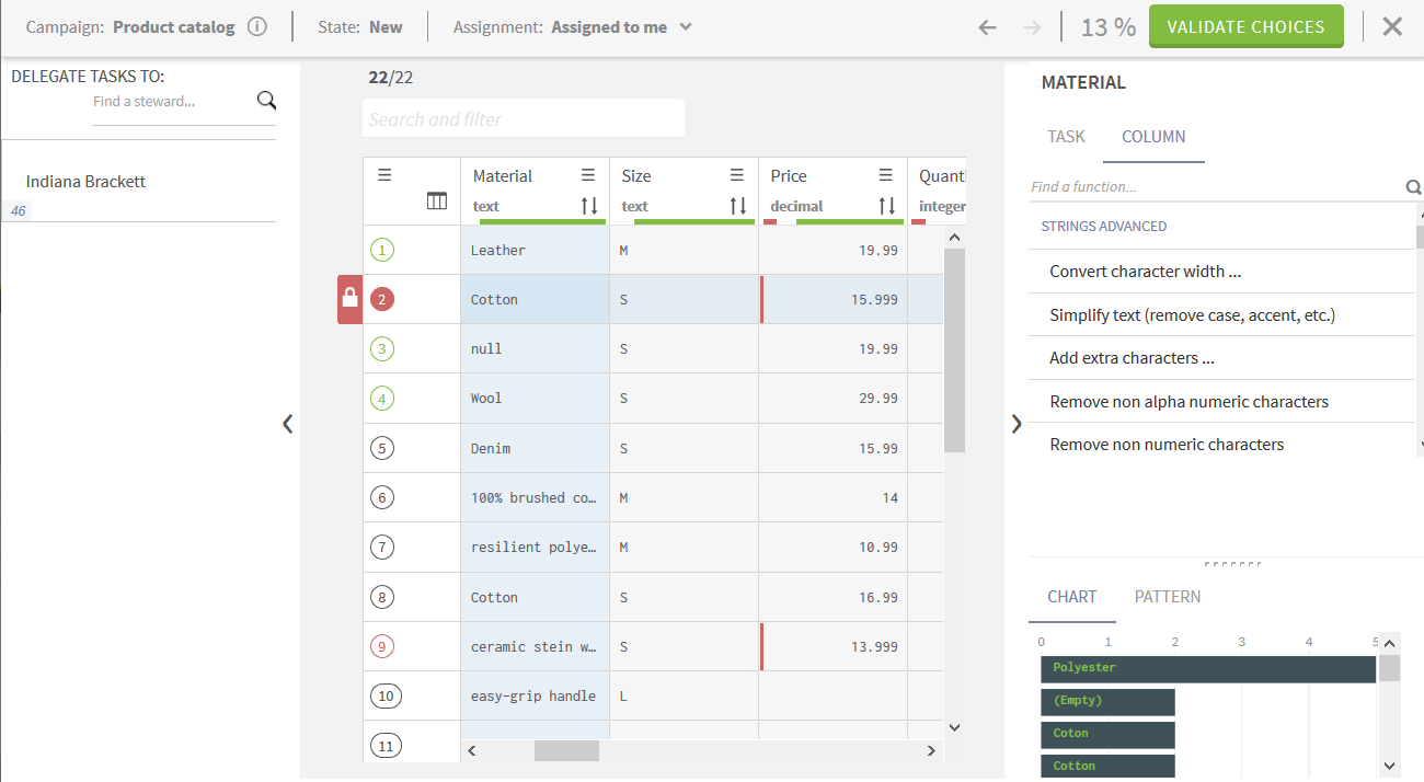 In this example, tasks are transitioned into two validation steps, one to fix the price values and accept or reject the changes made on records by data inspectors, and the second to approve and accept or reject the changes made on records. The data steward assigned the last validation step can mark the tasks as resolved or send them back to any step in the workflow.