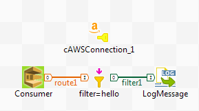 - Link the cAWSSQS to cMessageFilter with the Row > Route connection and cMessageFilter to cLog with the Row > Filter connection.