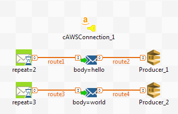 - From the Palette, drag and drop a cAWSConnection, two cTimer, two cSetBody, two cAWSSQS components onto the design workspace.