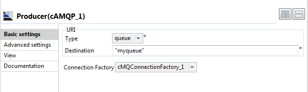 1. Double-click the cMQConnectionFactory component to display its Basic settings view in the Component tab.