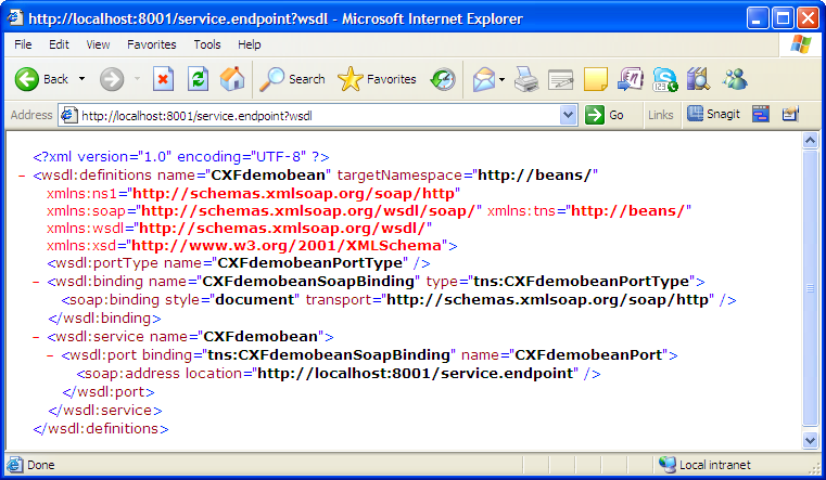 As shown in the code, the cSOAP component produces the Web service from an predefined bean beans.CXFdemobean using the endpoint URL http://192.168.0.212:8001/service.endpoint.