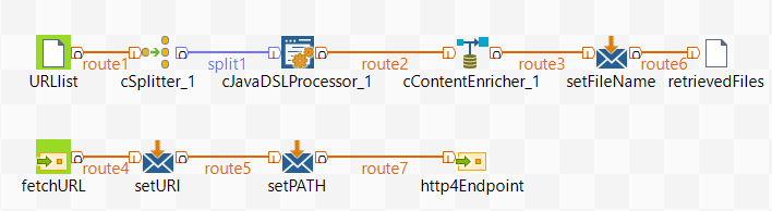 In this scenario, we will use the Camel component HTTP4 and the cContentEnricher component to retrieve messages from a list of URLs. To do this, we need to build two sub-routes, one to read a file with a list of URLs and send the messages to the local file system, the other to retrieve the messages on these URLs.