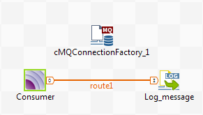 - From the Palette, drag and drop a cMQConnectionFactory, a cMQTT, and a cLog component onto the design workspace.