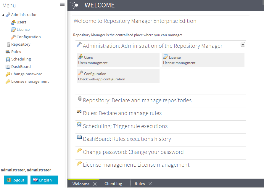 When you access Talend Repository Manager for the first time, you must set the license key provided by Talend and complete checking steps before being able to log in.