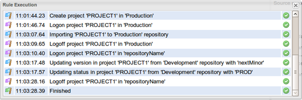 According to the configuration in the Source update version and the Source status change fields of the Rules configuration panel, the version and the status of the migrated items are changed in the Development repository.