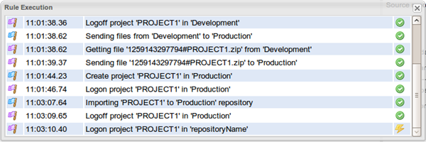 According to the configuration in the Source update version and the Source status change fields of the Rules configuration panel, the version and the status of the migrated items are changed in the Development repository.