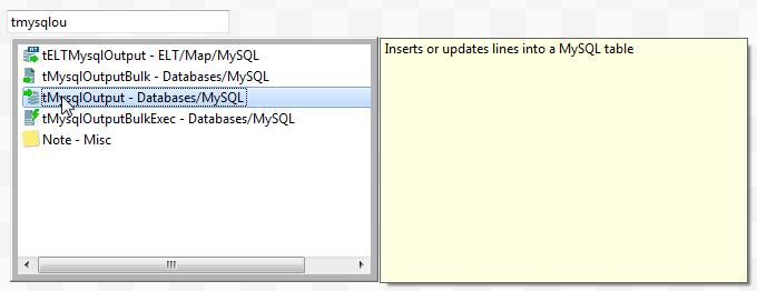 3. Click where the tLogRow was on the design workspace and type the name of tMySqlOutput or part of it, and then select and double-click tMySqlOutput on the list to add it onto the design workspace.