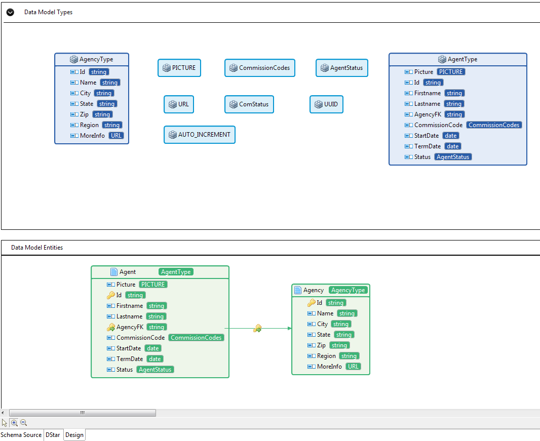 The view presents the data model in a graphical format, which shows the custom types and complex types in the upper area and the data model entities in the lower area.
