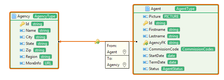 In the Data Model Entities area, each time you click a complex type, a link will be displayed pointing to the representation of the complex type in the Data Model Types area, which helps you to learn the definition of the complex type.