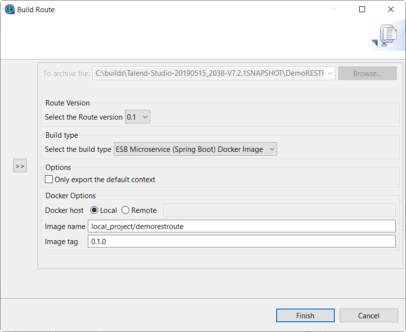 4. In the Build type area, select Microservice (Spring-boot) for ESB Docker image to build your Route as a Microservice Docker image.