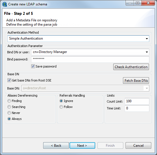 Fetch Base DNs button retrieves the DN automatically from Root.