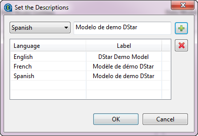 6. If needed, click the ... button next to Description to open a dialog box where you can add multilingual descriptions to the new data model.