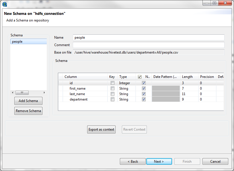 A dialog box opens listing the HDFS schemas in the connection.