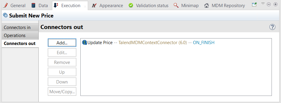 A Talend connector must be attached to one or more of the defined tasks in order to establish connectivity between the workflow and master data. Then the steps for adding Talend connectors to tasks that require automatic intervention are the same as for those that require human intervention.