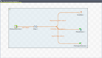 In this example, tMap is used to determine the data flow. All the error records that need reprocessing are notified to business users via email. The rejects are written to a file, probably for reprocessing, and the delta records are written to the table.