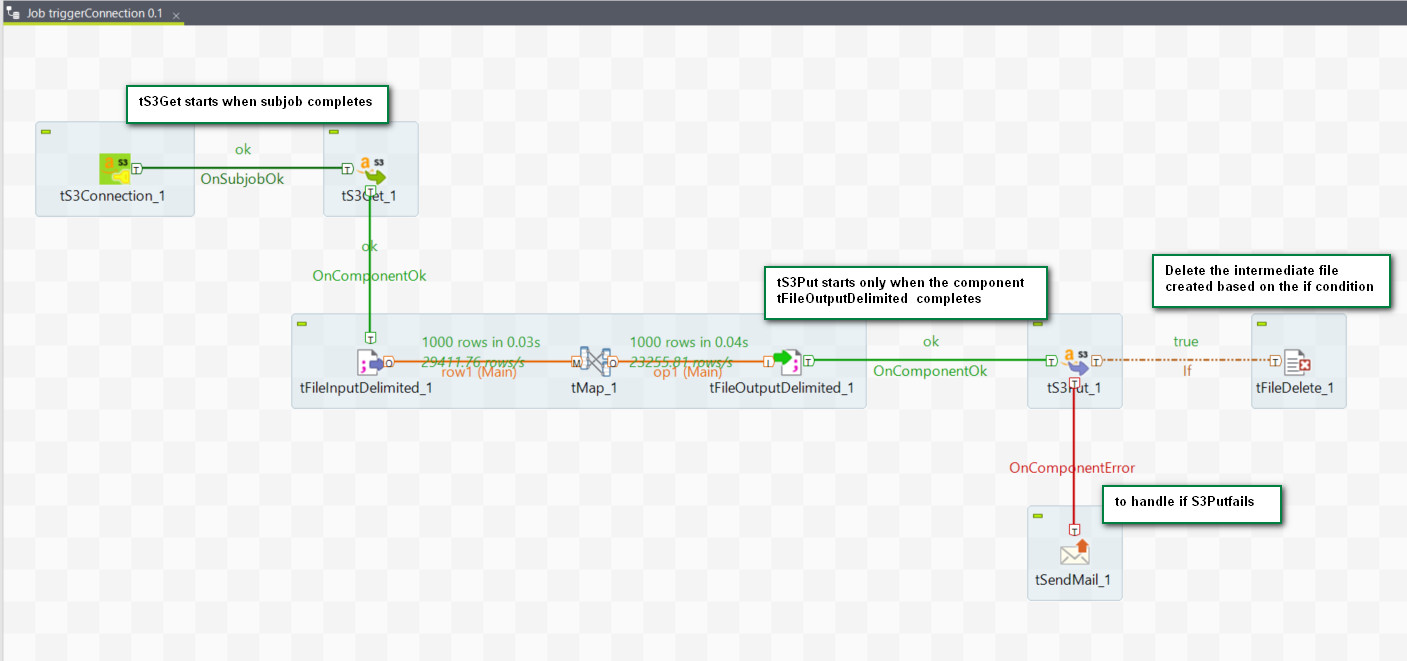 Trigger connections are the connections that are triggered based on certain conditions. In this example, the conditions are that a component or subJob is either completed successfully or has errors. The connection in use creates a dependency between Jobs or subJobs, which are triggered one after the other according to the nature of the trigger. It is important to note that no data is handled through these conditions.