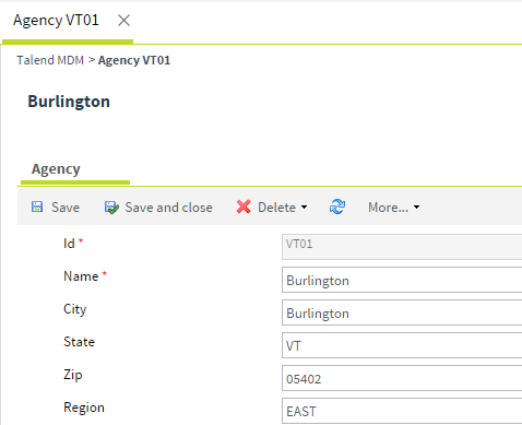 When a business user accesses the data model holding this entity through Talend MDM Web UI and browse for any of the data records in this entity, the detailed view of the data record will have the agency name as its heading as defined in the above procedure.