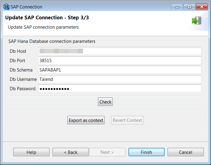 - Click Check to validate the SAP HANA database connection details.