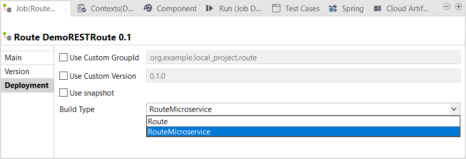Open the Route or Job that you want to build as a Microservice Docker image in the design work space. In the Deployment view of the Job tab, from the Build Type list, select RouteMicroservice for Routes and Microservice for ESB for Jobs. Save the Route or Job.