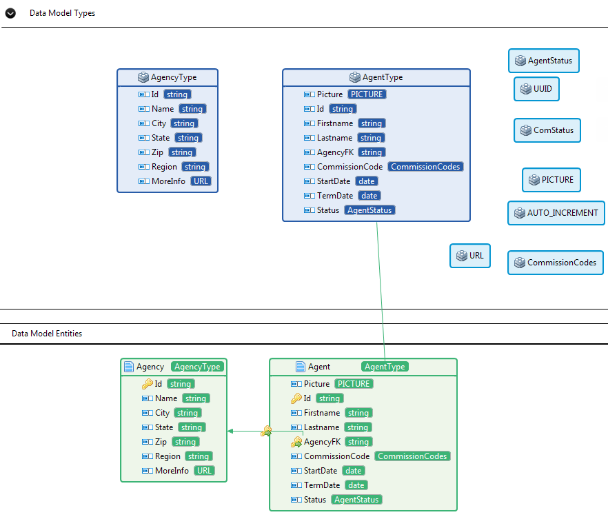 The view presents the data model in a graphical format, which shows the custom types and complex types in the upper area and the data model entities in the lower area.