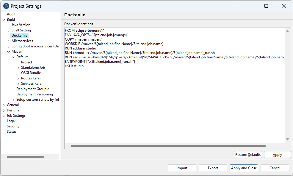 Talend Studio allows you to customize the Dockerfile settings, which is used to build your Docker images.
