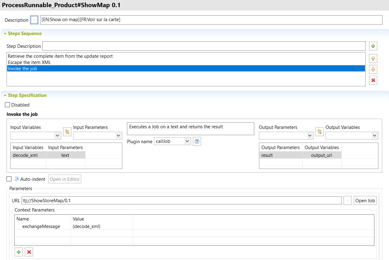 The below example guides you through the steps of creating a Runnable Process Runnable_Product#ShowMap that invokes a Job ShowStoreMap to find the address of a store on the Google Maps.