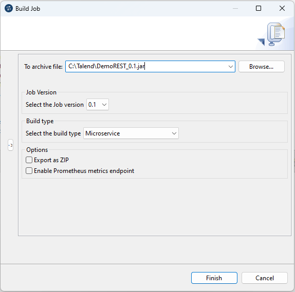 The Export as ZIP option to export the Job to a .zip file, which provides an external config folder and start scripts to start the Microservice with the external config folder for Linux (.sh) and Windows (.bat). If this option is not selected, the Job is exported as a .jar file by default.