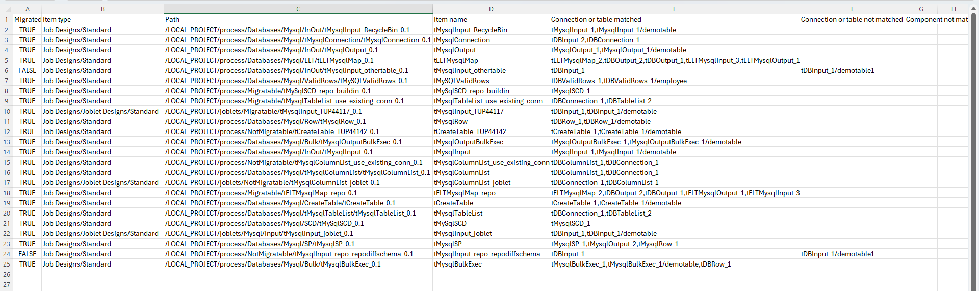 The migration report is in CSV format containing the following information of the migrated Jobs: