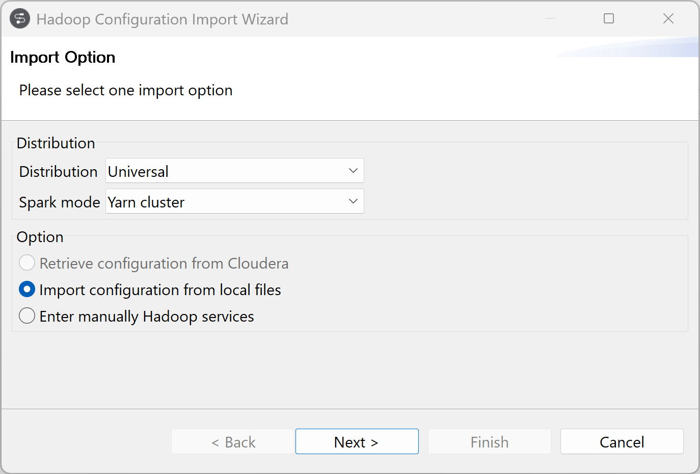 4. Select your distribution, Universal in this example, and select the Spark mode, Yarn cluster in this example.