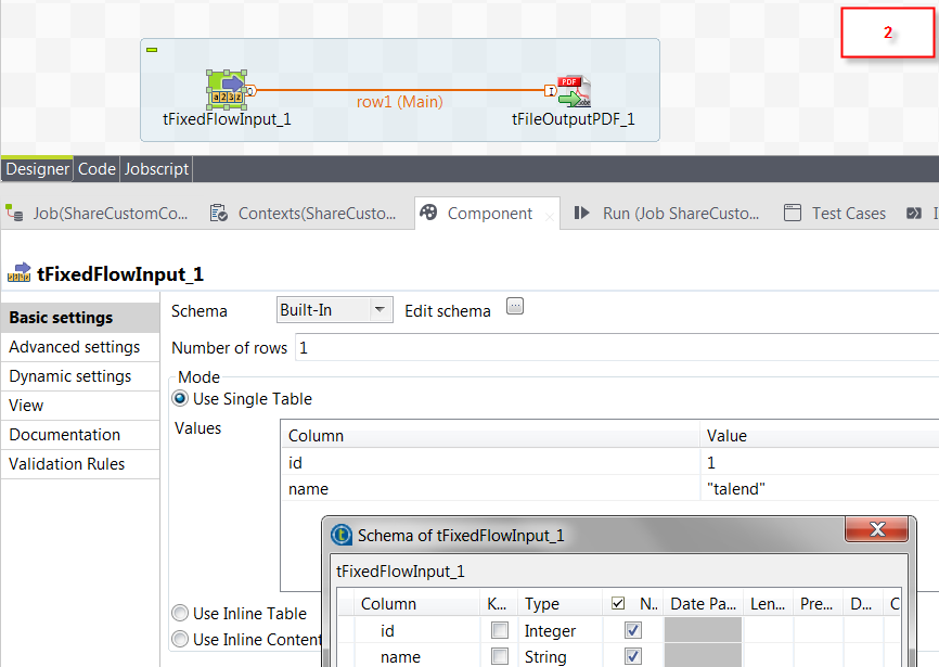 3. Place the tFixedFlowInput and the custom component tFileOutputPDF from the Palette to the design workspace.