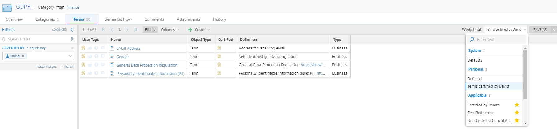 For example, you can see the list of terms contained in the GDPR category.