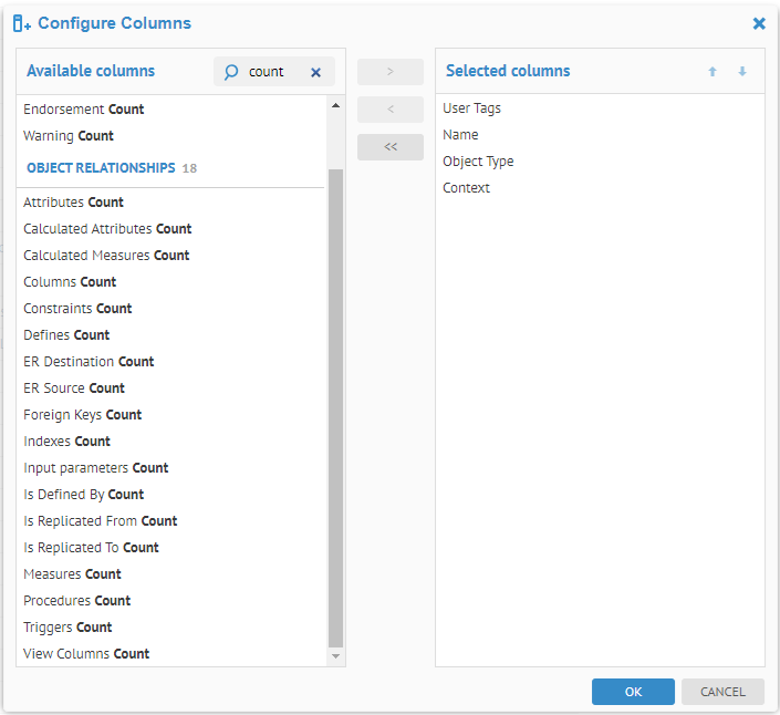 You may always filter the results by what is already presented. E.g., if one wishes to only see columns for Object Type of View Column, you may simply right-click a cell in the grid that contains that value and select that option.