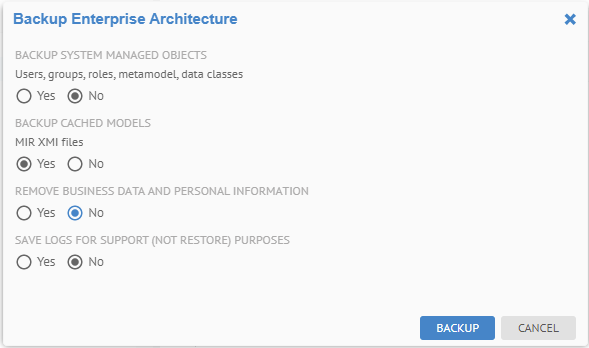 - Sign in as a user with at least the A and with Metadata Reader privileges to all the models and configurations contained with the backup scope.