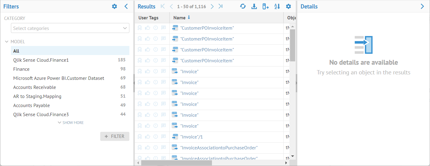 In addition, if there is a directory structure in a model (e.g., a database import containing multiple schemas or a repository import containing directory structure, models, connections, etc.) then one may also use checkboxes to filter the results.