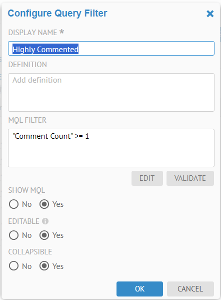 Click EDIT under the MQL FILTER, and build the query for Comment Count greater than or equal to 1.