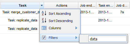 À partir de la page Execution History, placez le curseur de la souris sur la colonne Task pour afficher la flèche vers le bas, et cliquez sur cette flèche pour faire apparaître la liste des options de filtrage.