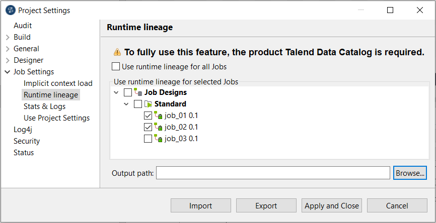 | Lignage lors de l'exécution | Le Studio Talend supporte à présent l'activation le lignage d'exécution pour les Jobs Standards, qui pourra être utilisé dans une version future par la capacité d'analyse de Talend Data Catalog pour les métadonnées d'exécution, par exemple, des requêtes avec des variables, des schémas avec des colonnes dynamiques, etc.