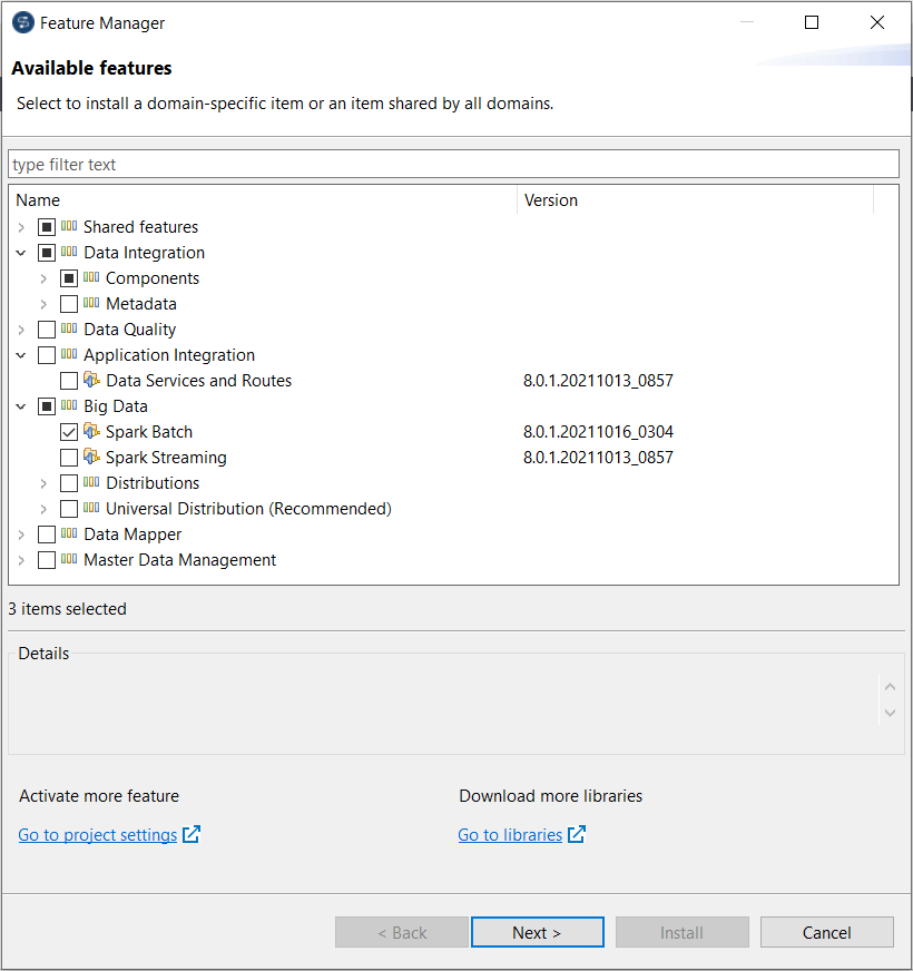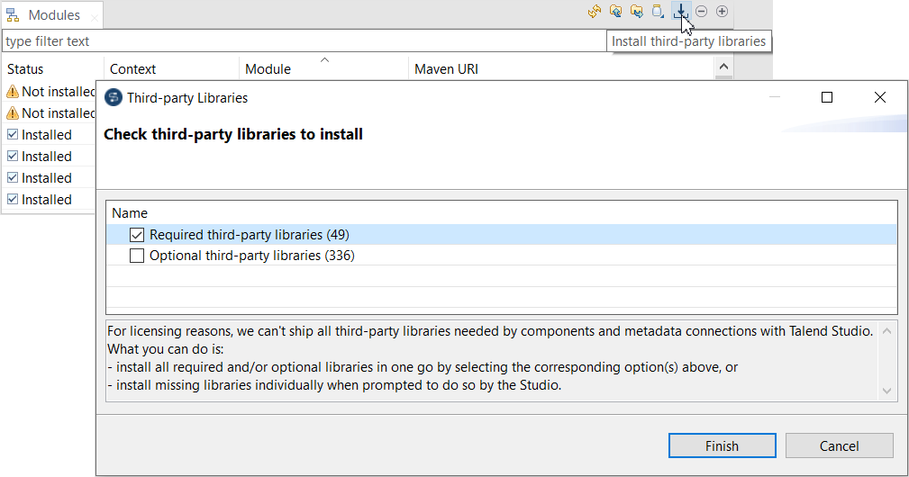 | Assistant Third-party Libraries (Bibliothèques tierces) | Un assistant Third-party Libraries (Bibliothèques tierces), permettant d'installer toutes les bibliothèques tierces en une fois est à présent fourni dans le Studio Talend. Cet assistant peut être ouvert en cliquant sur le bouton Install third-party libraries (Installer les bibliothèques tierces) dans la vue Modules ou sur le lien Go to libraries (Accéder aux bibliothèques) dans l'assistant Feature Manager (Gestionnaire des fonctionnalités).