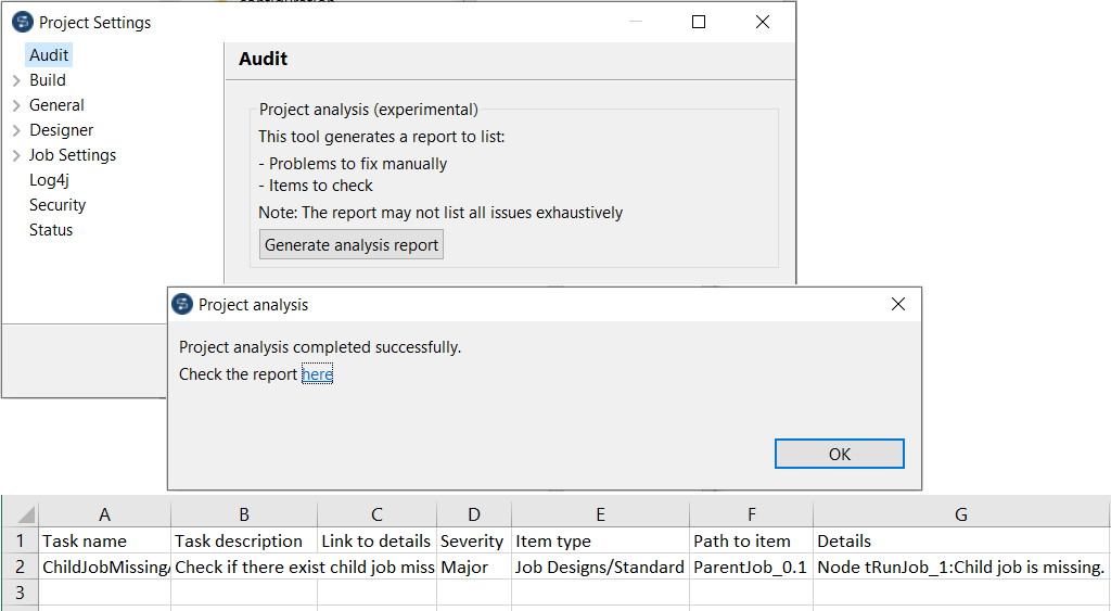 | Outil d'analyse des projets | Le Studio Talend fournit à présent un outil d'analyse de projet pour permettre d'analyser vos projets. Cet outil génère un fichier CSV de rapport listant les éléments à vérifier et les problèmes à corriger manuellement.