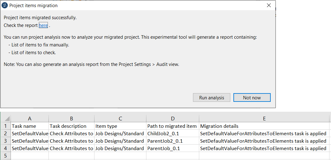 | Rapport de migration | Le Studio Talend génère à présent un fichier CSV de rapport listant tous les éléments migrés ou importés lors de la migration d'un projet ou de l'import d'éléments à partir d'une version antérieure du projet.