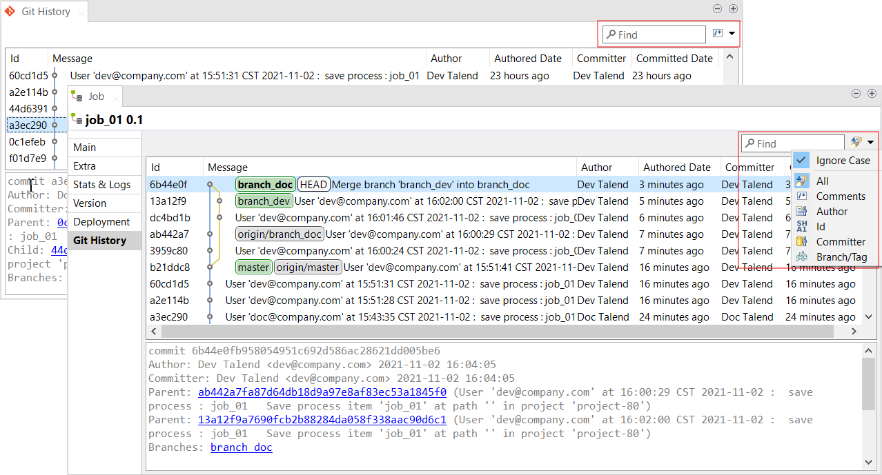 | Support de recherche des commits Git | Le Studio Talend support à présent la recherche des commits Git dans la vue Git History (Historique Git) et dans l'onglet Git History (Historique Git) de la vue Job.